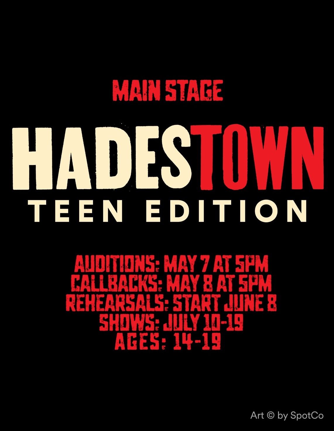 Please arrive at least 15 minutes before auditions begin to sign in and complete all paperwork. Doors open at 3:30 pm.